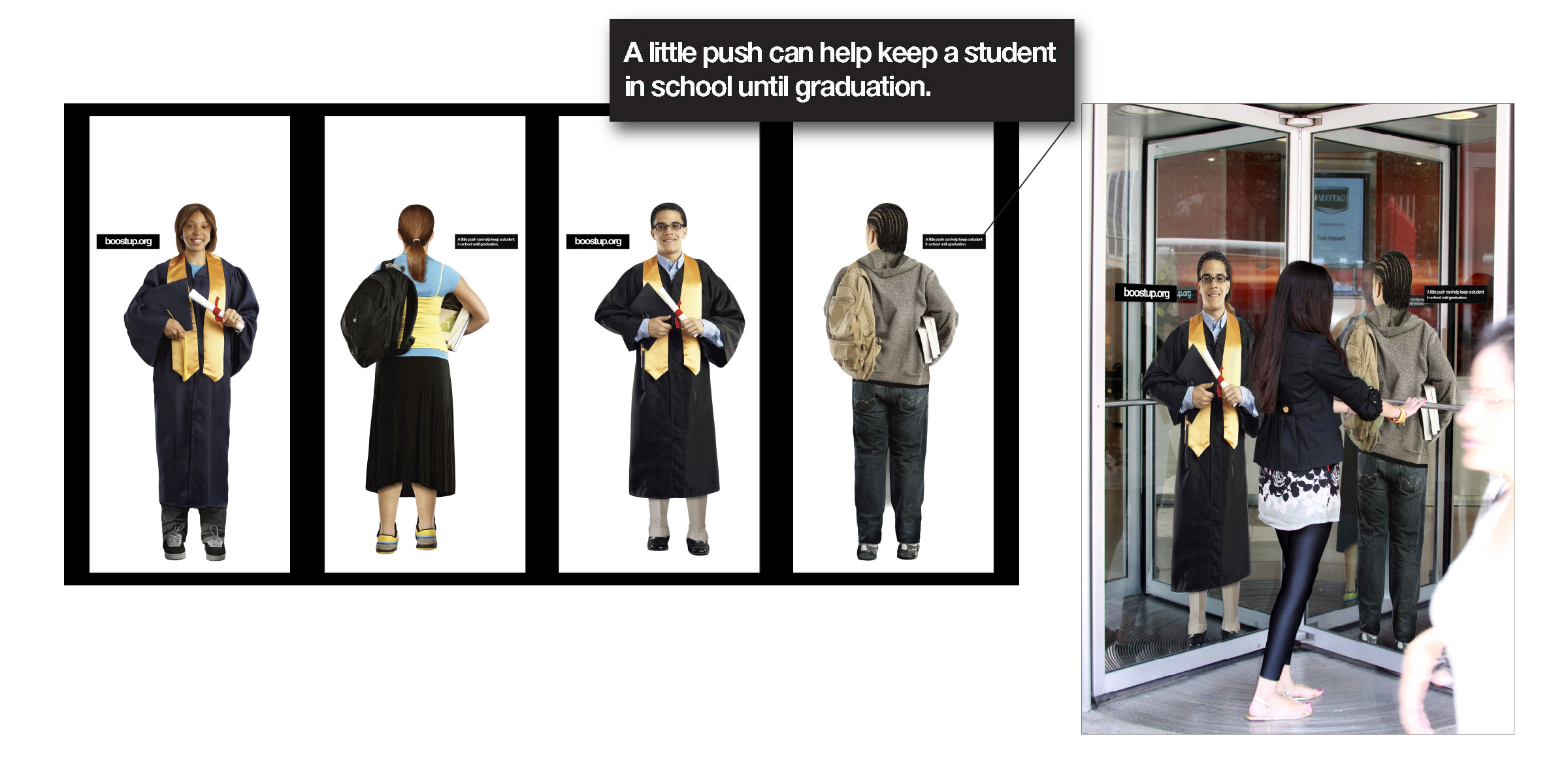 BoostUp.org / Revolving Door: People entering the building could give a "push" to a student and then see the results of their effort as that same student came around the other side in a cap and gown.