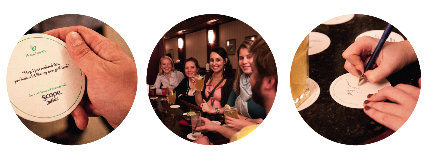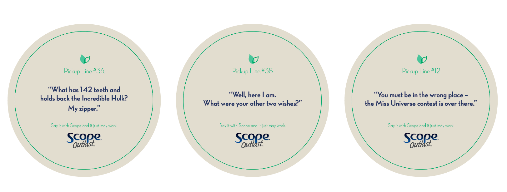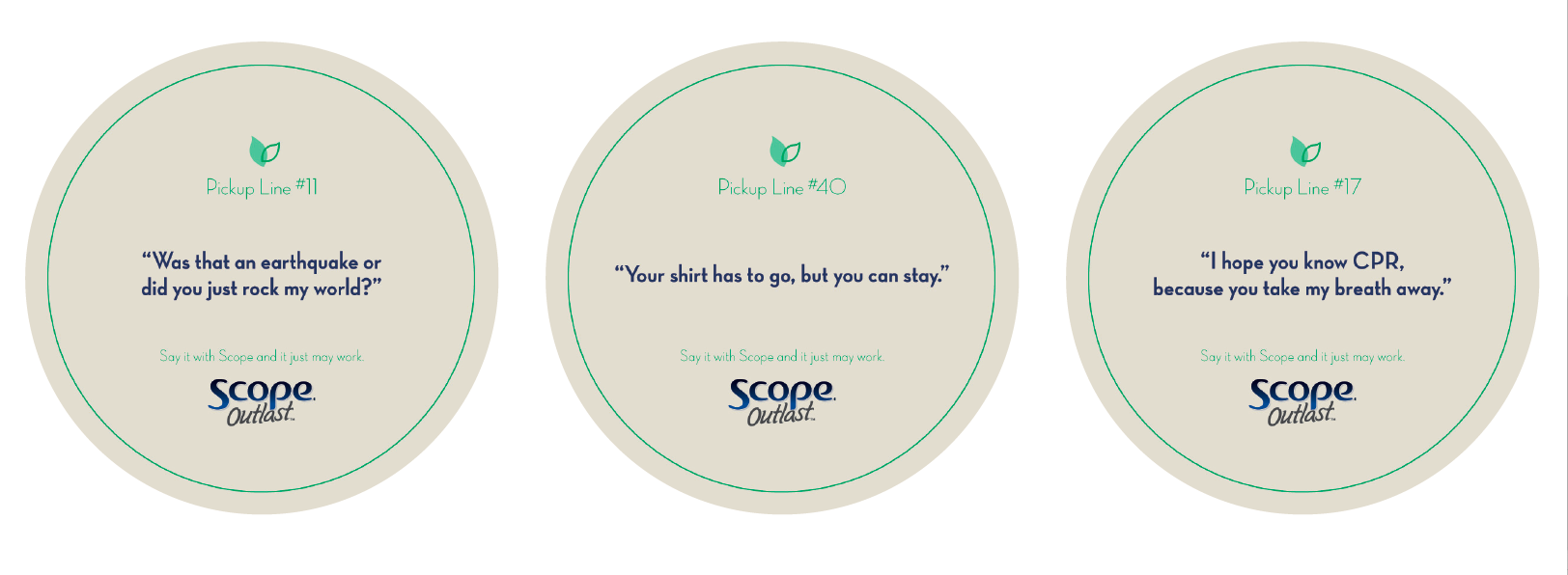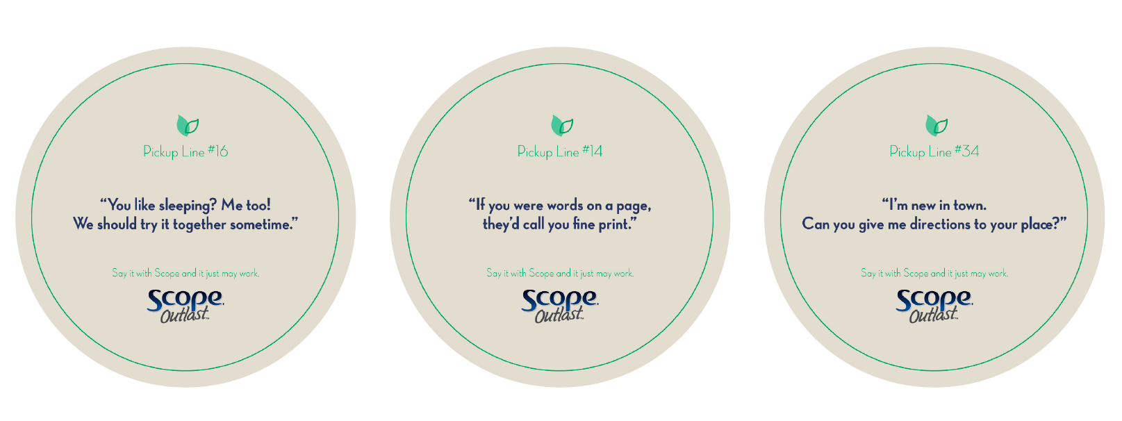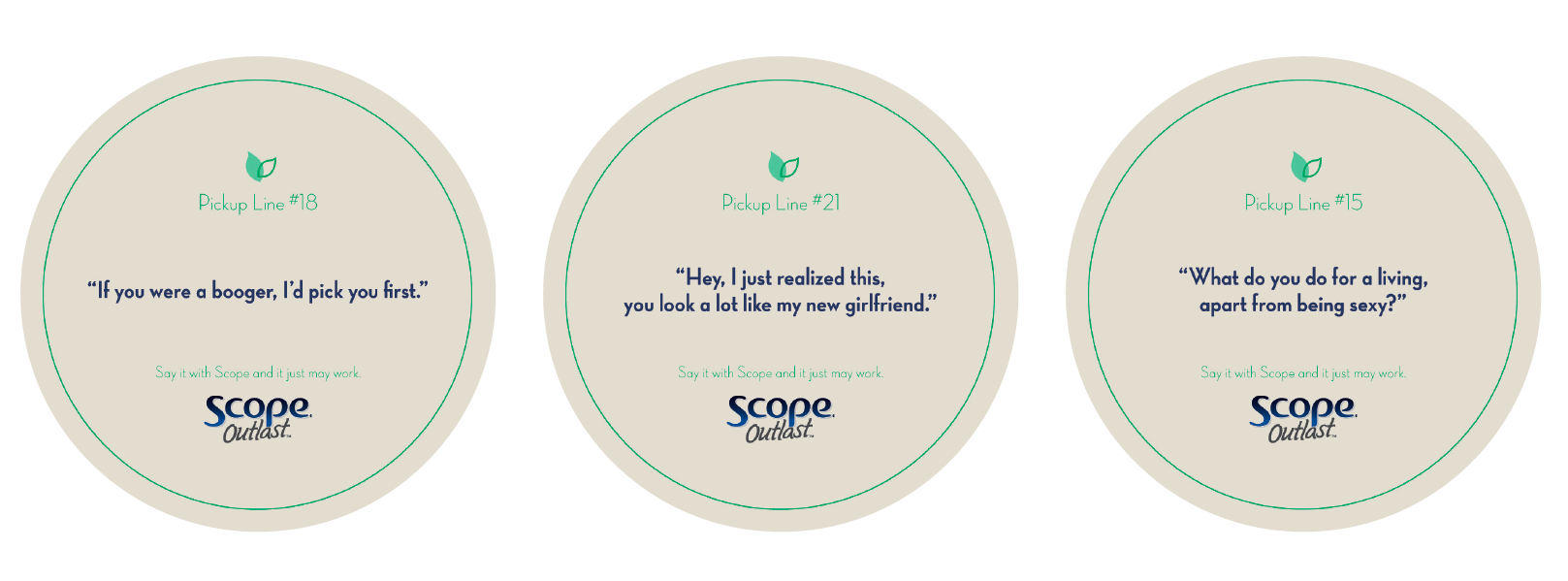 In order to remind consumers of the importance of long-lasting fresh breath, when and where it matters most, we created bar coasters with outlandish, highly unlikely pickup lines. But with the fresh breath one gets from Scope, the consumer just may pull one of these lines off successfully.